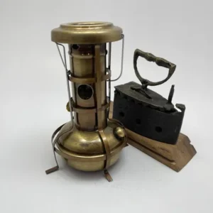 A Kerosene Lantern/Stove: A tall, round item made of brass. It was used either for illumination (as a lantern) or as a small portable stove (like a Primus burner).