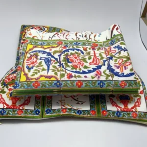This is a decorative textile set consisting of a table runner and a pillowcase (or cushion cover). The fabric is richly adorned with intricate, multi-colored patterns that closely resemble classical Persian tilework and Qalamkari (hand-painted cloth) motifs, including stylized flowers and vines. The design incorporates elegant Persian calligraphy within bordered sections. The items are used for home décor, adding a strong traditional Iranian aesthetic to furniture and tables.