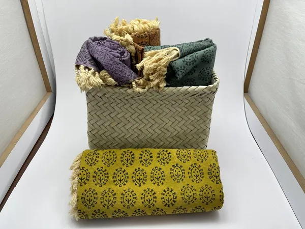 Qalamkari is a traditional Persian art of hand-painted or block-printed fabric. The textiles, which include tablecloths, shawls, or throws. Qalamkari piece in a yellow-mustard hue with repeating traditional motifs. The set is used for home décor and practical utility, showcasing Iranian artistry.